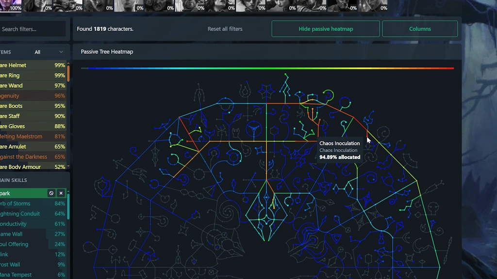 In addition to this, there is a passive skill tree heatmap, which shows the percentage of characters that have taken each and every node on the skill tree in a nice colorful way.